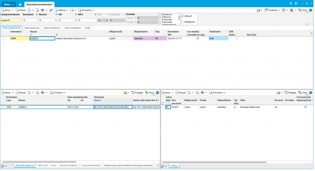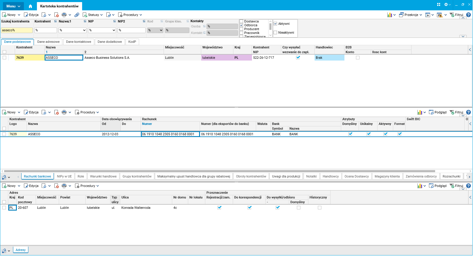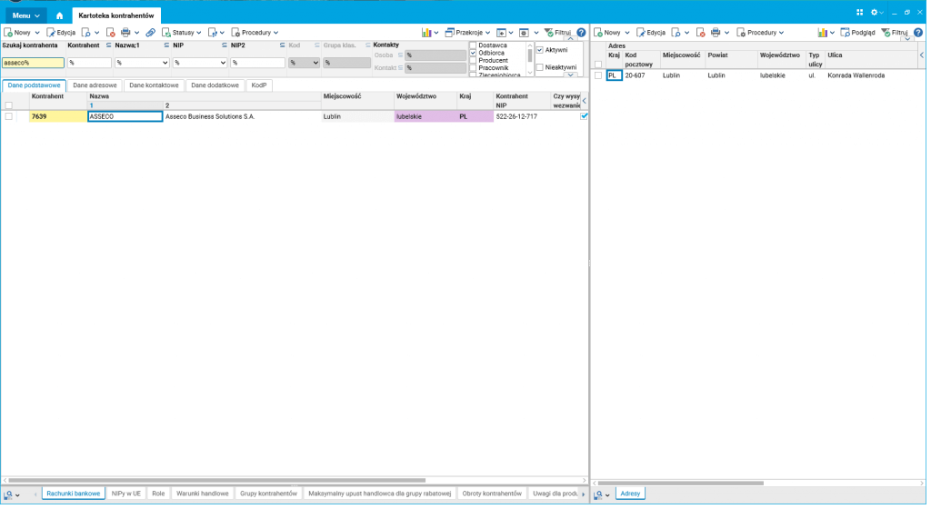• główne okno prezentowało podstawowe informacje o kontrahencie,