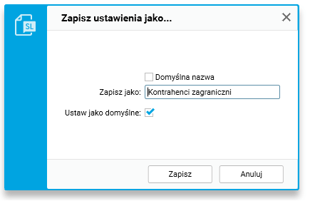 • Możliwość powrotu do ustawień systemowych (Ustawienia podstawowe). Opcja pozwala zapisać nazwę konfiguracji okna oraz ustawić ją jako domyślne ustawienie:
