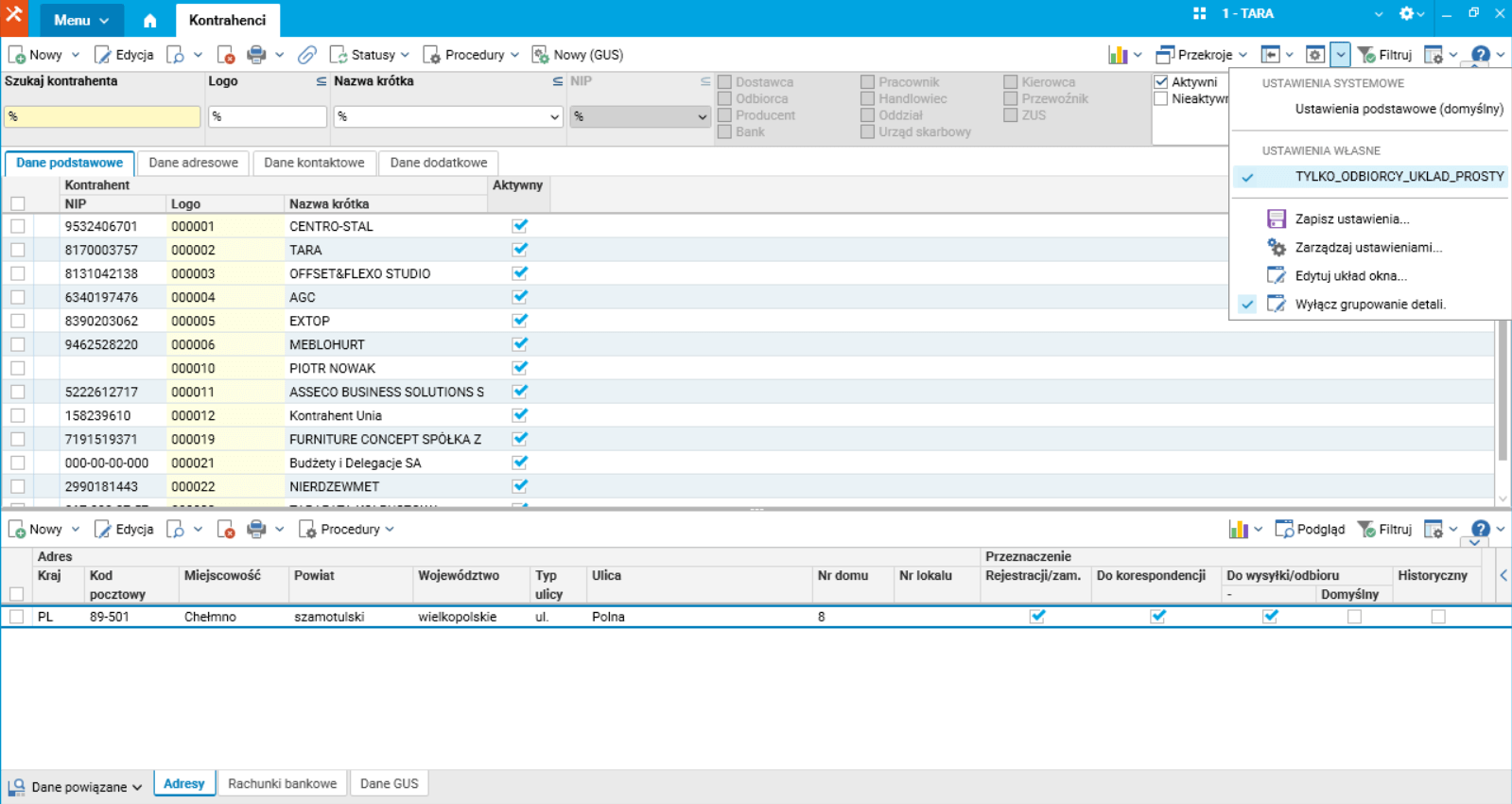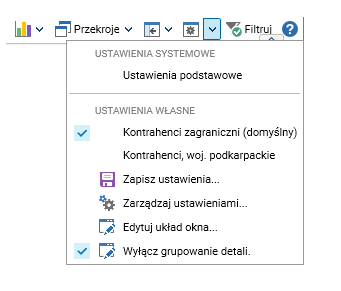 • Możliwość aktywowania własnych ustawień użytkownika (na obrazku poniżej są to przykładowe ustawienia „Kontrahenci woj. podkarpackie” oraz „Kontrahenci zagraniczni”) Ustawienia własne można uczynić też domyślnymi dla słownika, wówczas przy otwarciu będą wczytywane automatycznie.