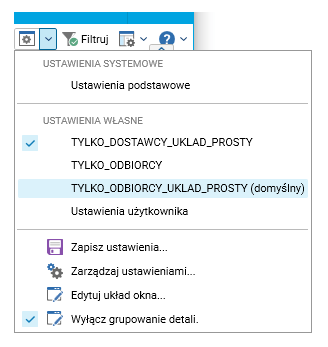W każdym momencie operator aplikacji ma możliwość przełączenia się między dostępnymi, wcześniej zapisanymi konfiguracjami ustawień okna, wśród których znajduje się ustawienie systemowe. W tym celu w menu Ustawienia należy wybrać pożądaną konfigurację. Wyboru może dokonać spośród ustawień własnych oraz ustawienia systemowego:
