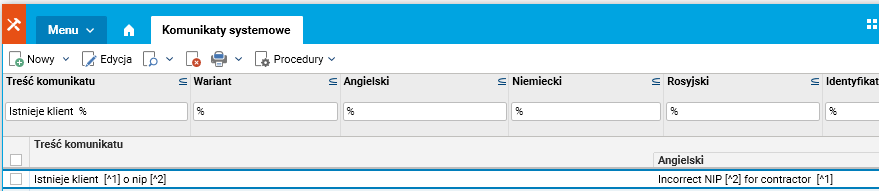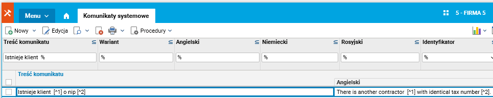 W tym miejscu należy zwrócić uwagę na wartości (w powyższym komunikacie) objęte w nawiasach kwadratowych. W ten sposób przekazywane są do treści komunikatu zmienne z danymi wartościami. Na powyższym przykładzie ^1 przekazuje do treści komunikatu logo kontrahenta, zaś ^2 jego nr NIP. W systemie funkcjonują komunikaty zarówno bez parametrów, jak i sparametryzowane w powyższy sposób. Tłumaczenia powinny uwzględniać występujące w treści parametry.