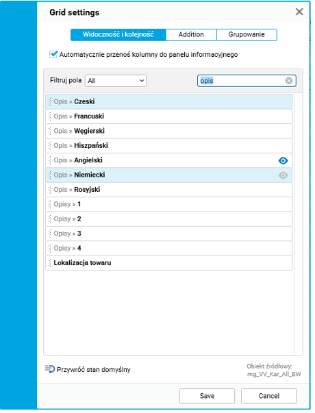 Także tutaj system Softlab ERP by Asseco pozwala na wprowadzanie tłumaczeń. Kolumną dedykowaną do wprowadzania tłumaczenia opisu kartoteki np. na język angielski jest „Opis;angielski”, którą możemy doświetlić w ustawieniach słownika:
