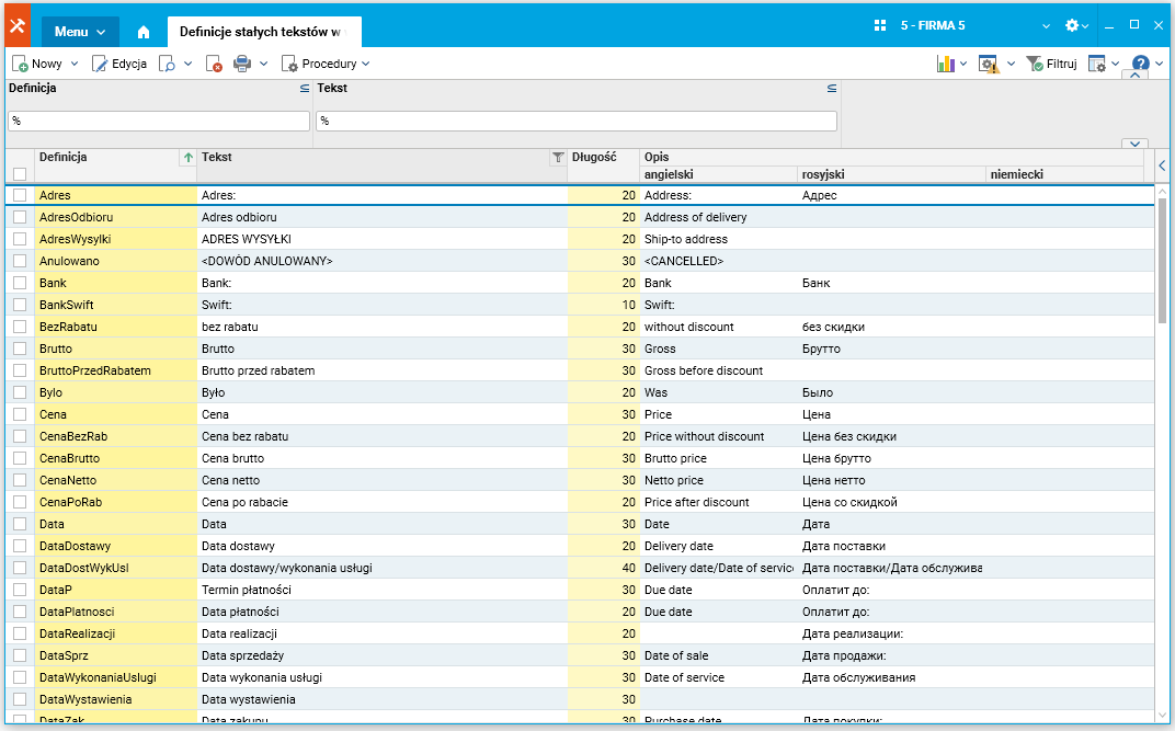 Rysunek 16 Widok słownika „Definicje stałych tekstów w wydrukach”