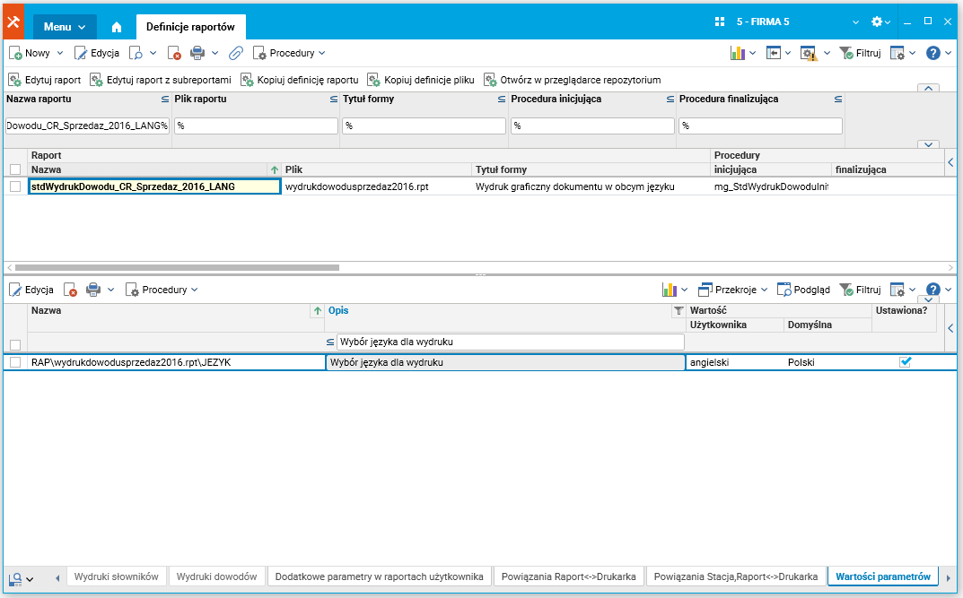 Drugim miejscem w systemie, które decyduje o tym w jakim języku dany wydruk będzie generowany, jest słownik szczegółu „Wartości parametrów” podłączony do głównego słownika SYSTEM-> Konfiguracyjne/Raporty/„Definicje raportów”. W tym słowniku parametrem określającym język generowanego raportu jest RAP[nazwa_pliku_wzorca.rpt]JEZYK („Wybór języka dla wydruku”):