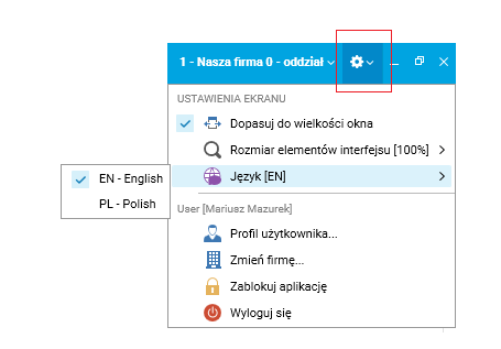 Od tego momentu, po każdym zalogowaniu użytkownik (w naszym przykładzie użytkownik o loginie „tsPK”) będzie korzystał z systemu w angielskiej wersji językowej. W dalszym ciągu będzie mógł przełączyć się również na inny dostępny język.