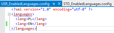 W pierwszym kroku definiujemy listę języków dostępnych w aplikacji (przed zalogowaniem do bazy danych). W tym celu należy utworzyć plik konfiguracyjny USR_EnabledLanguages.config na podstawie pliku STD_EnabledLanguages.config, gdzie wprowadzamy oznaczenia języków obsługiwanych przez klienta dostępowego (analogicznie jak jest to zapisane dla języka polskiego i angielskiego):
