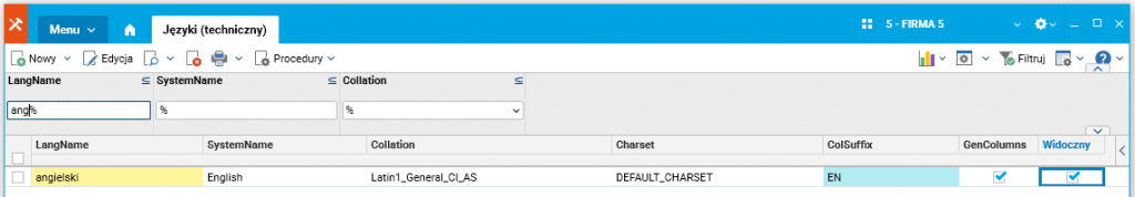 Dodatkowo, podobną konfigurację należy wykonać z poziomu słownika konfiguracyjnego „Języki (techniczny)”, gdzie określamy listę języków z dostępnymi tłumaczeniami (po zalogowaniu do bazy danych). Dla uproszczenia przyjmijmy, że będzie to język angielski: