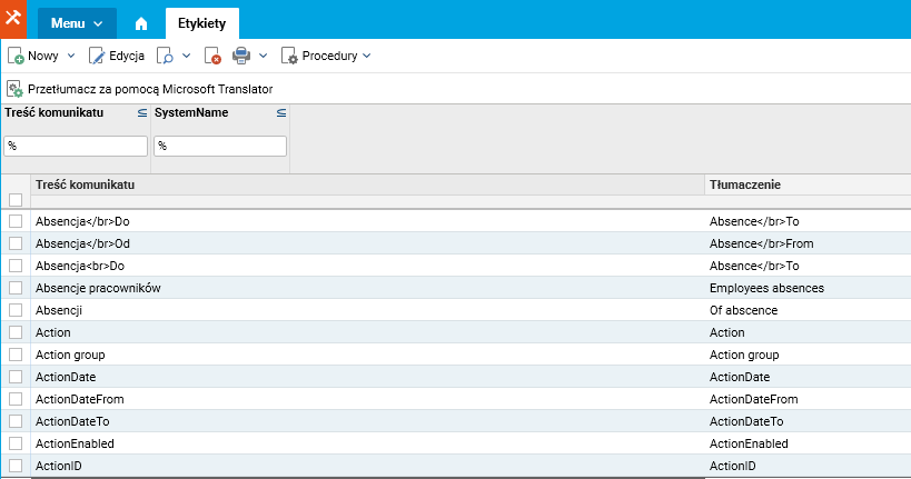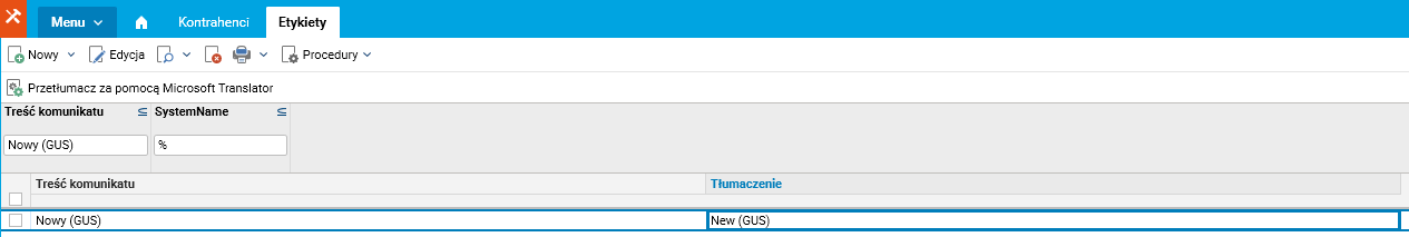 Wykonanie tłumaczeń polega na wyszukaniu nieprzetłumaczonych elementów i wprowadzeniu tłumaczenia. Możliwe jest również skorzystanie z procedury, która pozyskuje automatyczne tłumaczenie z serwisu Microsoft Translator.
