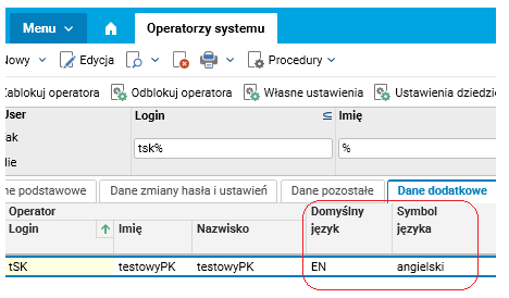 W tym celu należy przygotować (w słowniku „Operatorzy systemu”) odpowiednią konfigurację dla wybranych operatorów. Na zakładce „Dane dodatkowe”, w polach „Domyślny język” oraz „Symbol języka” należy wskazać jako domyślny język angielski: