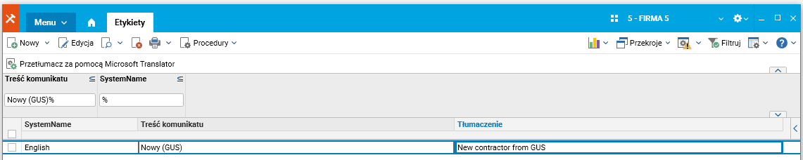 Rysunek 8 Słownik „Etykiety” z wyfiltrowanym tłumaczeniem