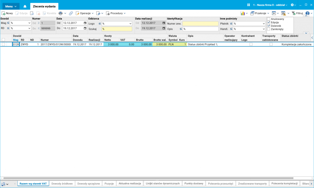 Firma realizuje zamówienia przez zlecenia wydania. Kierownik magazynu na bieżąco monitoruje status realizacji poszczególnych zleceń wydania.