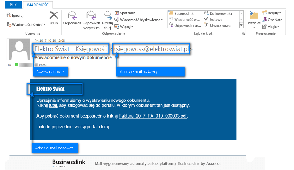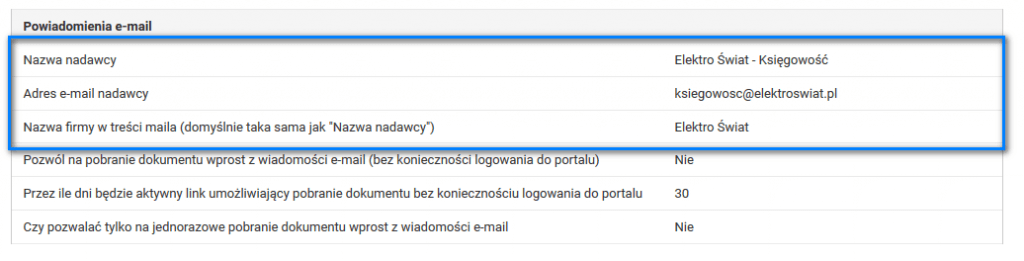 Usługa Businesslink umożliwia modyfikację parametrów powiadomień e-mail w danej instancji usługi oddzielnie, według potrzeb klienta. Nadawca wiadomości e-mail, adres zwrotny dla automatycznej korespondencji, jak również wyświetlana nazwa wystawcy dokumentu nie powinny być uniwersalne. Do tej porty usługa nie dawała możliwości personalizacji atrybutów wiadomości i były wysyłane one z uniwersalnymi atrybutami dla wszystkich instancji, co utrudniało identyfikację nadawcy wiadomości.