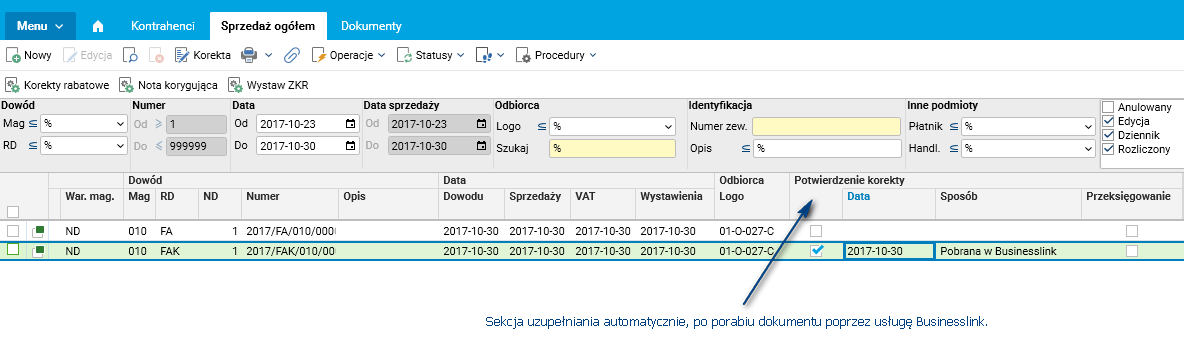 Dostarczenie dokumentu korekty faktury do portalu Businesslink i jego pobranie przez odbiorcę daje możliwość automatycznego potwierdzenia faktury korygującej w module finansowo-księgowym.