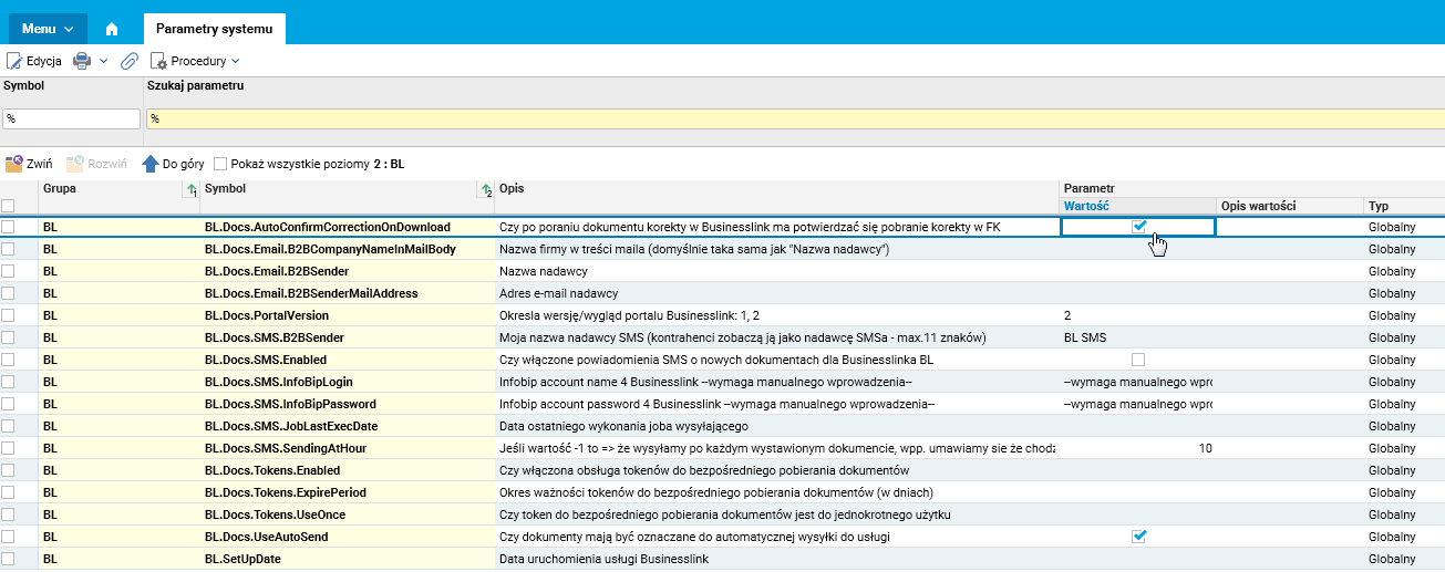 2.      Ustawić w systemie ERP parametr globalny BL.Docs.AutoConfirmCorrectionOnDownload na wartość 1.