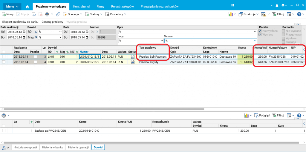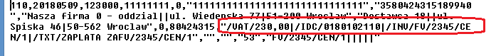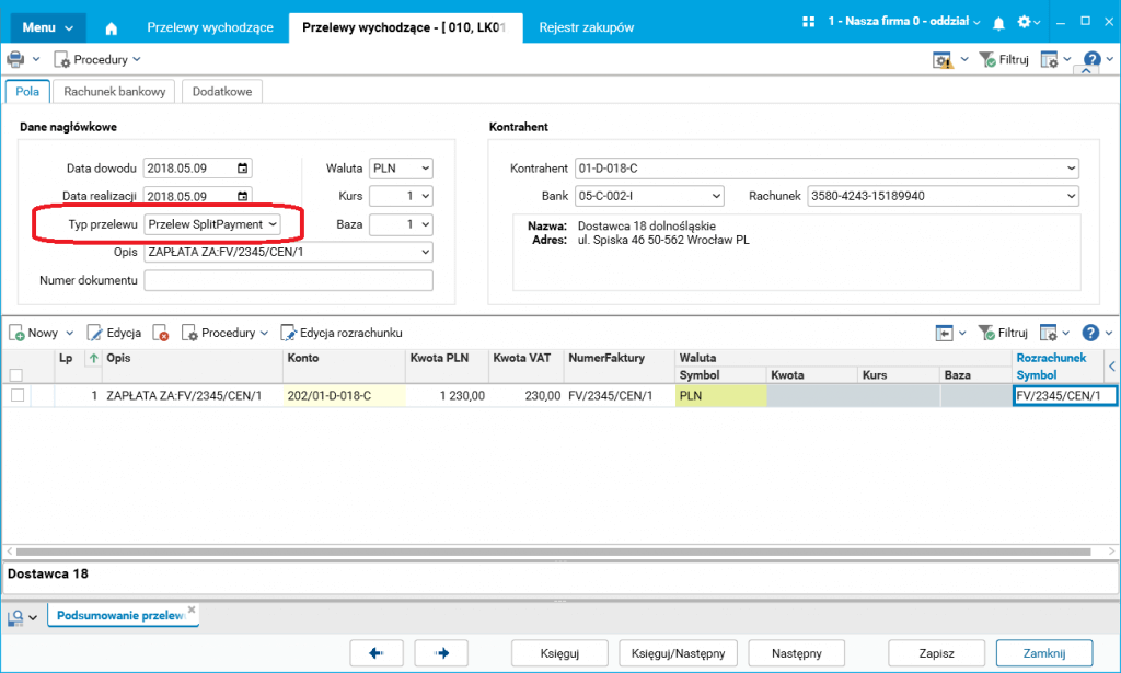 Rys. Przykładowa linijka przelewu wychodzącego typu Split Payment