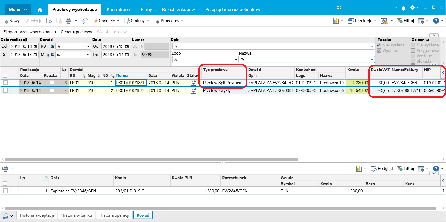 W słowniku Przelewy wychodzące zostały dodane nowe kolumny z informacjami wykorzystywanymi do obsługi przelewu Split Payment: