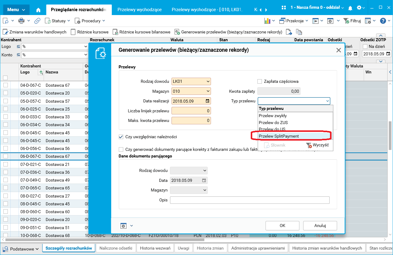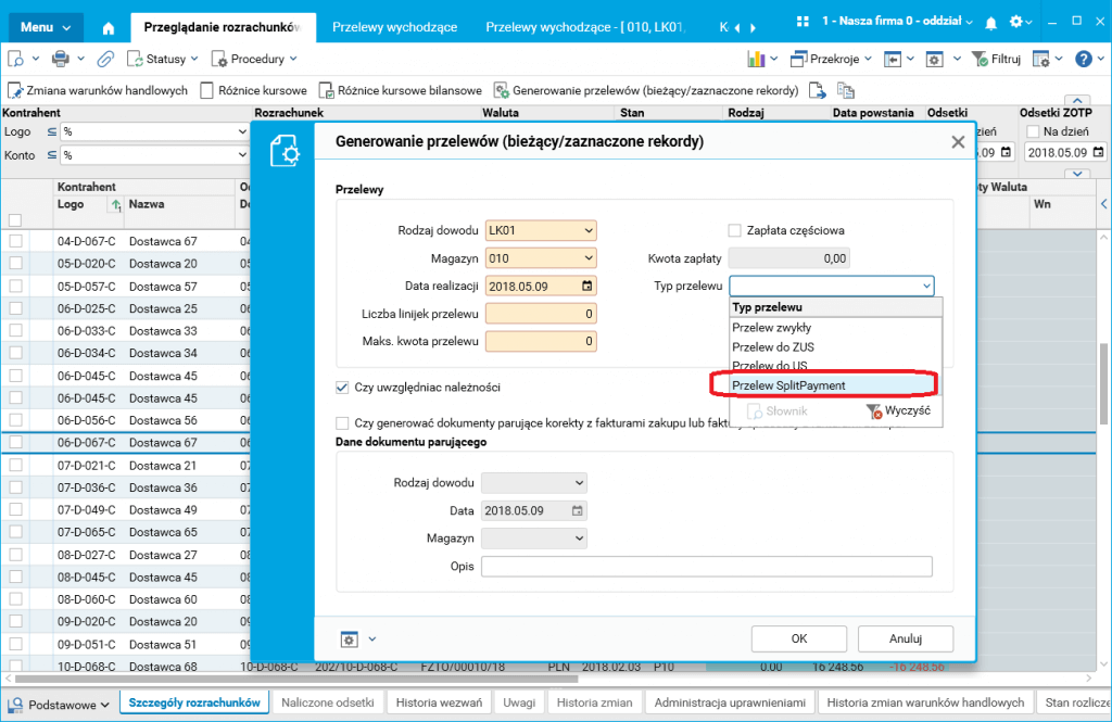 Typ przelewu może być inicjowany dla danego kontrahenta według konfiguracji dostępnej w słowniku Kontrahenci w szczególe Warunki handlowe kontrahenta.