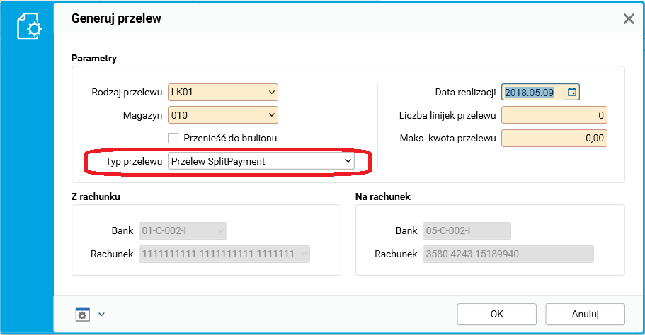 Rys. Generowanie przelewu ze słownika Rejestr zakupów