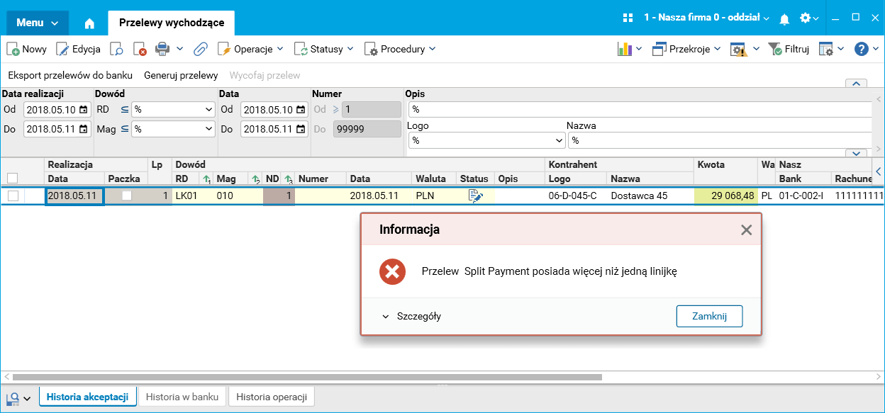 Rys. Blokada potwierdzenia przelewu Split Payment z wieloma pozycjami