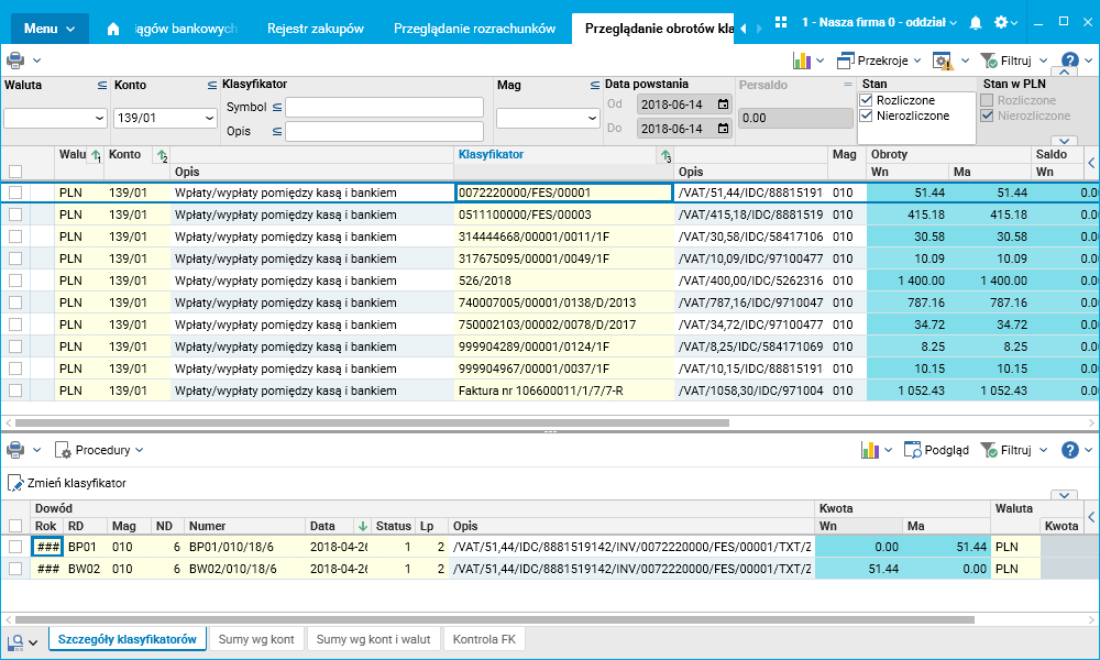 Poniżej przedstawiamy przykład takiego księgowania. Jak widać, wyciąg bankowy powiązany z rachunkiem bieżącym założył zapis klasyfikowany, a wyciąg bankowy konta VAT rozliczył zapis.