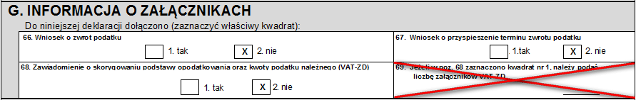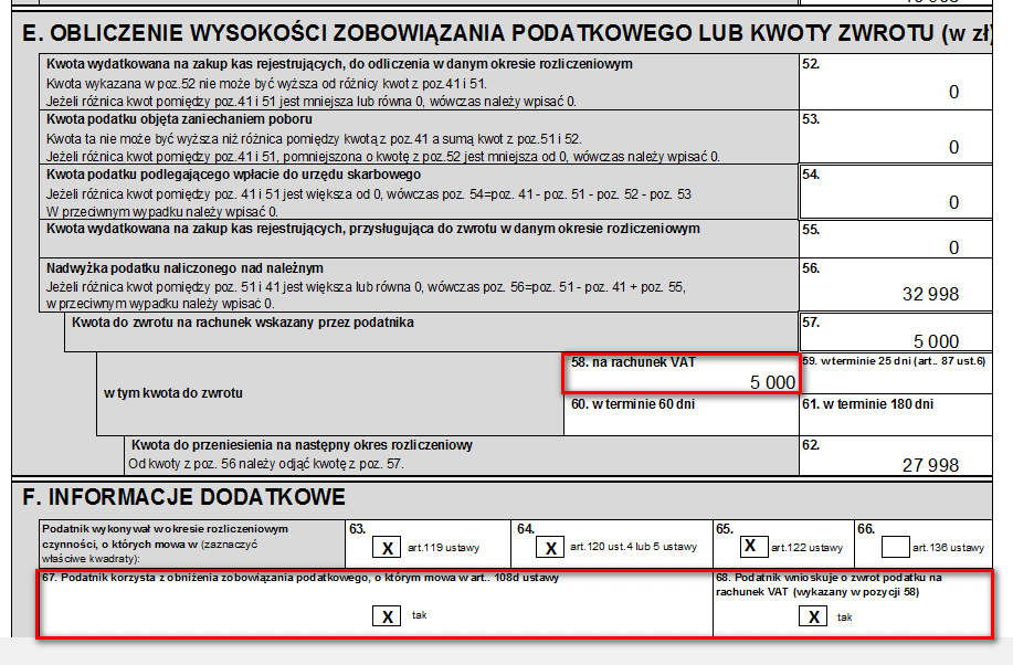 2. W sekcji F zostały dodane dwie nowe pozycje: 67. Podatnik korzysta z obniżenia zobowiązania podatkowego, o którym mowa w art. 108d ustawy oraz 68. Podatnik wnioskuje o zwrot podatku na rachunek VAT (wykazany w pozycji 58).
