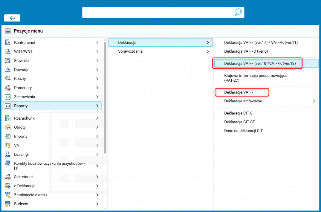 Rys. Ścieżki dostępu – Deklaracja VAT-7 (ver.18) oraz VAT-7K (ver.12)