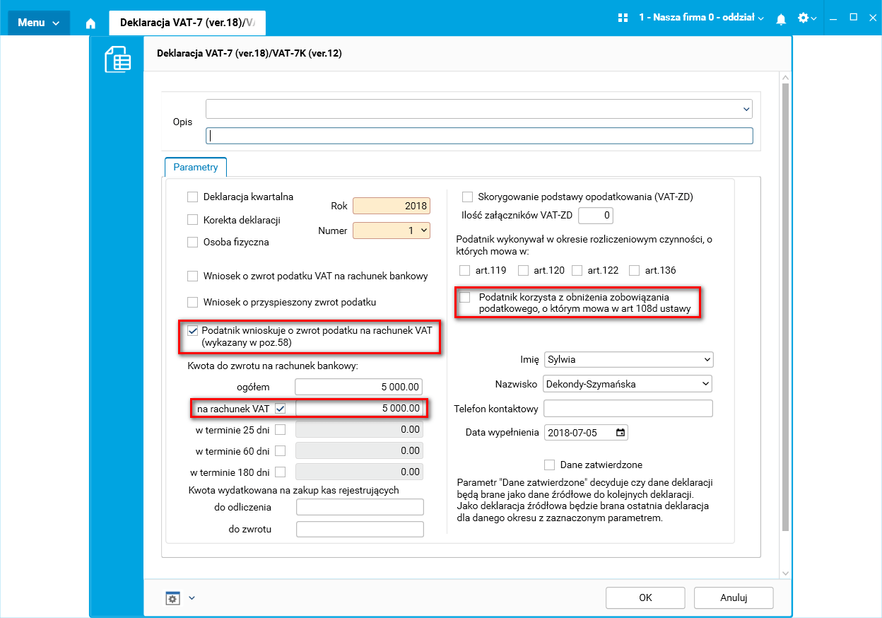 Rys. . Parametry procedury Deklaracja VAT – 7 (ver.18)/VAT-7K (ver.12)