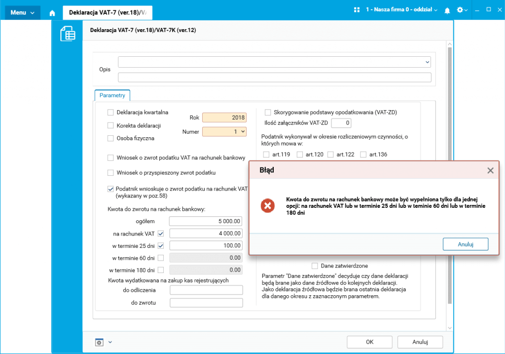 Uwaga! Jeśli podatnik zadeklaruje w polu ogółem kwotę do zwrotu, może wybrać tylko jedną z opcji: na rachunek VAT lub w terminie 25 dni, lub w terminie 60 dni, lub w terminie 180 dni, w przeciwnym razie zostanie wyświetlony komunikat ostrzegawczy: