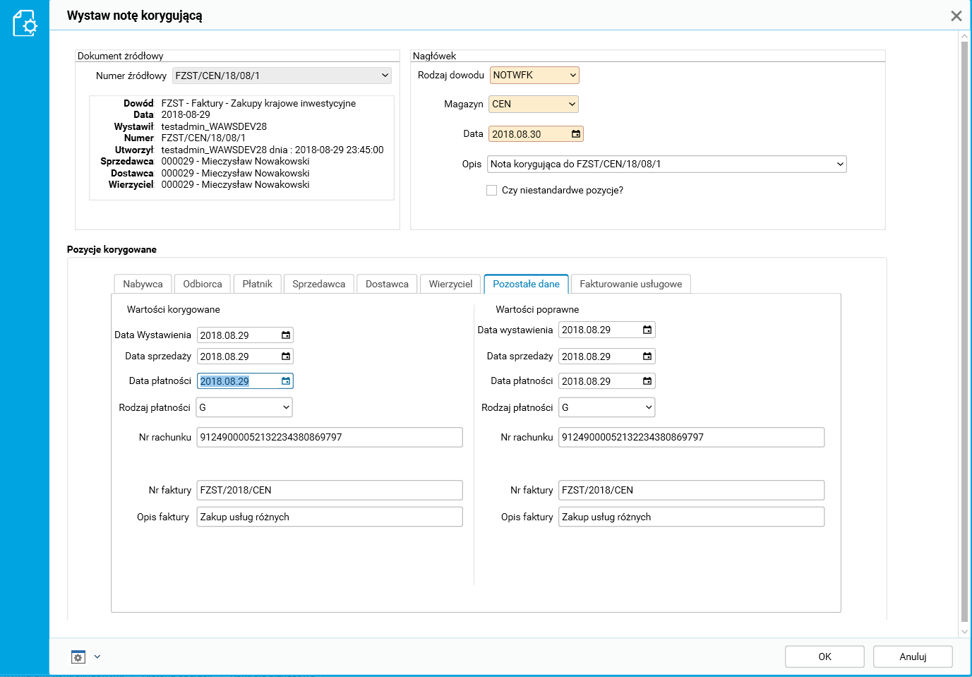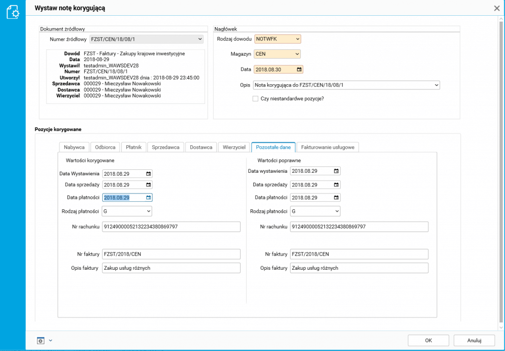 W procedurze Wystaw notę korygującą dostępnej w słowniku Rejestr zakupów, na zakładce Pozostałe dane dodano następujące pola: data wystawienia, data sprzedaży, rodzaj płatności, nr rachunku bankowego, nr faktury.