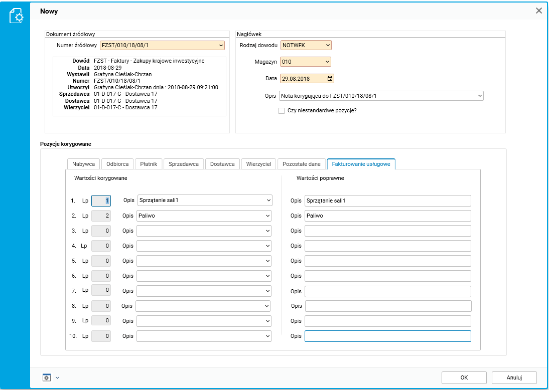 Dodano również nową zakładkę Fakturowanie usługowe, która pozwala na wprowadzenie do dziesięciu pozycji z fakturowania usługowego i korygowanie ich opisu.