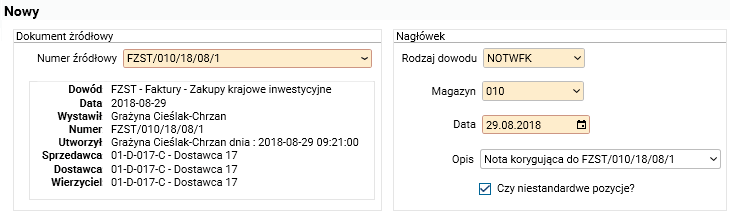 Rys. Procedura Wystaw notę korygującą – zaznaczona opcja Czy niestandardowe pozycje?