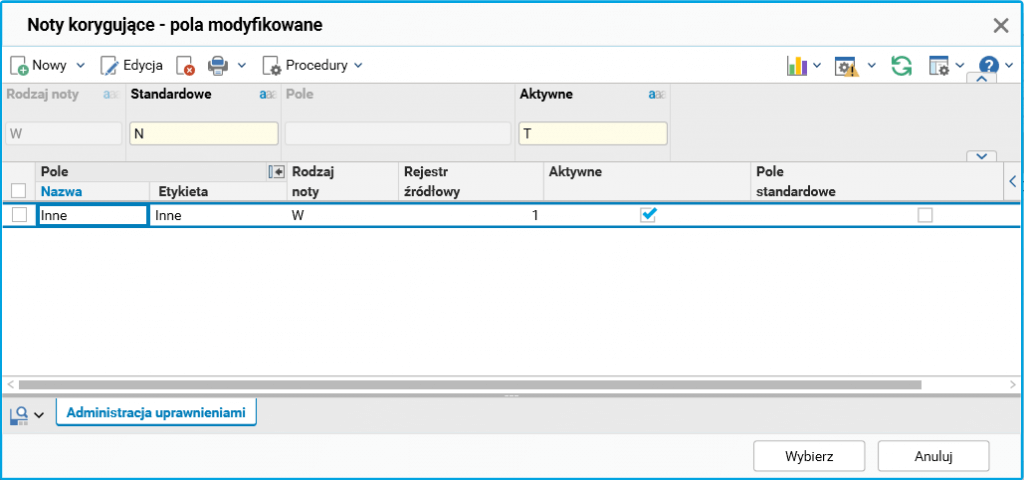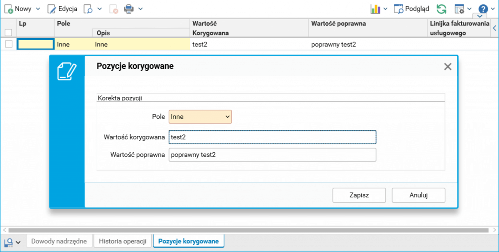 Następnie, po zapisaniu noty w słowniku Noty korygujące wystawione, w szczególe Pozycje korygowane można dopisać pole niestandardowe. Przykładowo, poniżej wprowadzono pole o nazwie Inne.