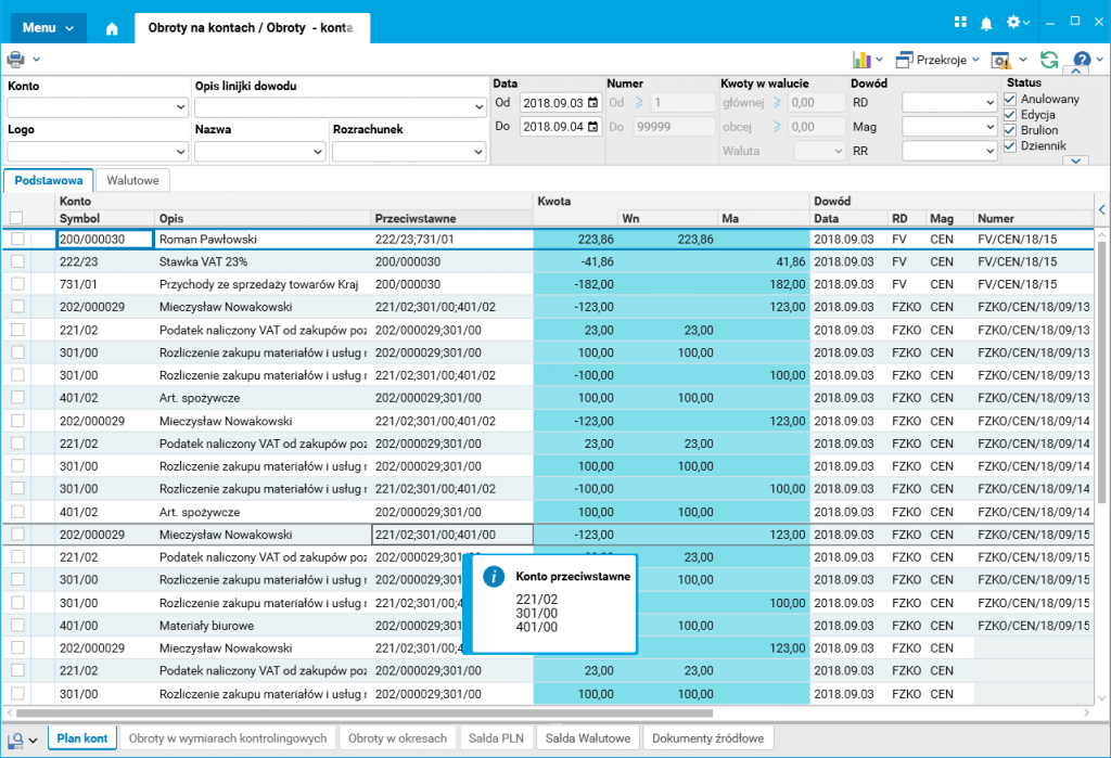Przeglądarka Obroty na kontach została wzbogacona o możliwość analizy kont przeciwstawnych do bieżącego dekretu. Możliwe jest podejrzenie konta przeciwstawnego użytego nawet w zapisie jednostronnym i nawet gdy kont przeciwstawnych jest wiele (np. konta przeciwstawne do księgowania kwoty brutto na fakturze zakupu). Funkcja ta sprawdzi się np. podczas analizy przychodów i kosztów z faktur. Do tej pory w ewidencji księgowej były widoczne konta przeciwstawne tylko w przypadku dekretów dwustronnych.