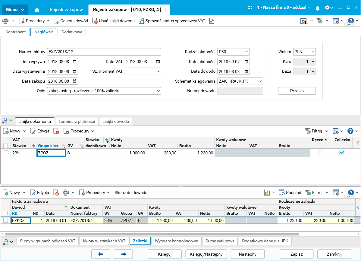 Rys. Faktura zakupu rozliczająca zaliczkę