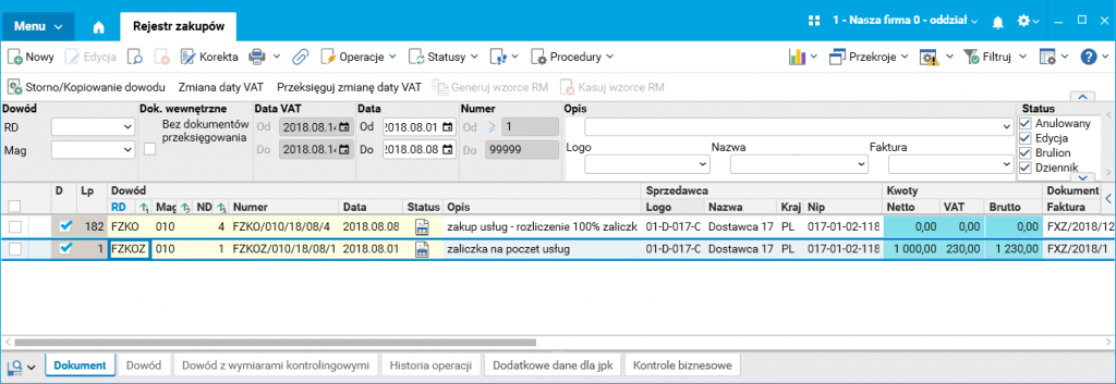 Zestawienia rejestrów VAT sprzedaży i zakupów zostały tak zmodyfikowane, aby prezentowały również dokumenty bez linijek (tylko nagłówki). Poprawiono również procedury napełniające struktury JPK VAT, aby uwzględniały dokumenty bez linijek.