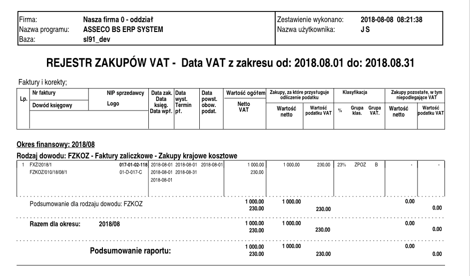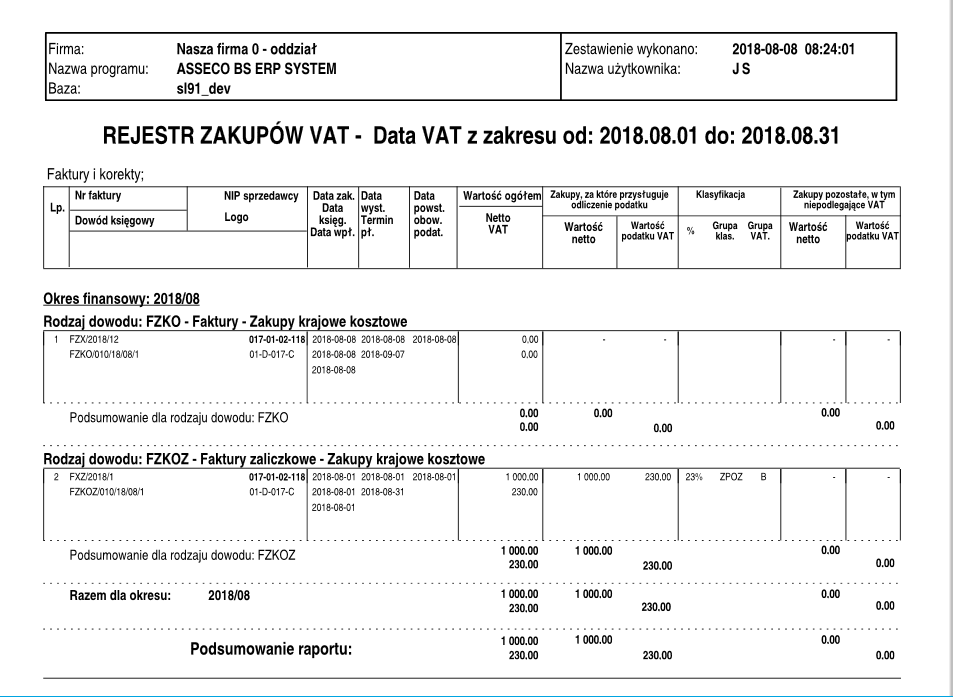 Rys. Wydruk rejestru zakupów VAT – parametr JpkVAT_ZeroweKwoty włączony