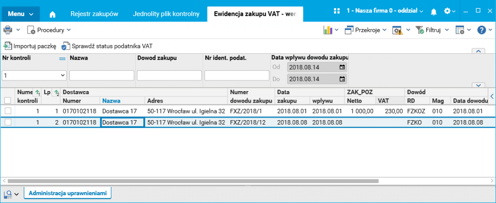 Rys. Jednolity plik kontrolny – ewidencja zakupu VAT – włączony parametr JpkVAT_ZeroweKwoty