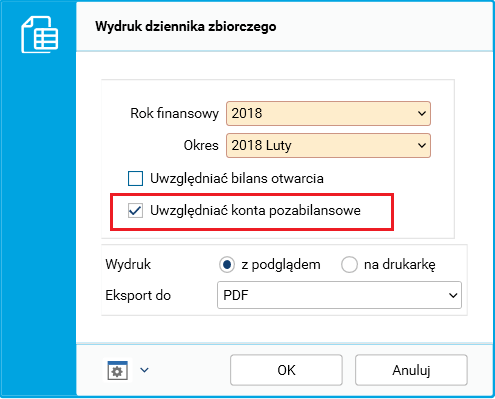 Do parametrów raportu Wydruk dziennika zbiorczego została dodana opcja Uwzględniać konta pozabilansowe.