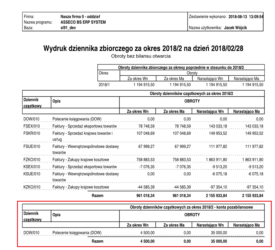 Zaznaczenie tej opcji spowoduje dodanie na wydruku sekcji zawierającej obroty na kontach pozabilansowych, pogrupowane według dzienników cząstkowych.