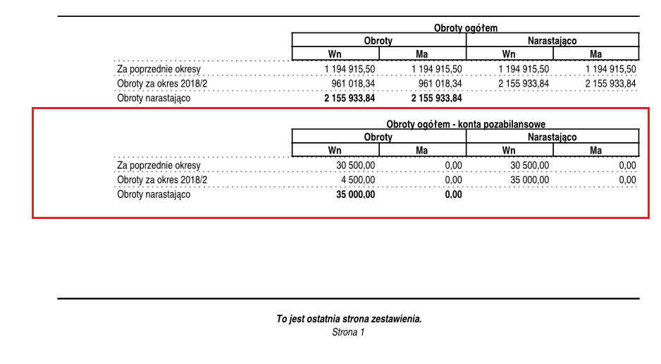 Także na podsumowaniu wydruku pojawia się dodatkowa sekcja, która sumuje obroty na kontach pozabilansowych, pod istniejącym dotychczas podsumowaniem obrotów na kontach bilansowych.