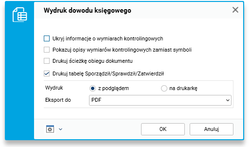 · dodano opcję decydującą o umieszczeniu na wydruku tabeli z miejscem na akceptację dokumentu przez osoby: sporządził/sprawdził/zatwierdził;