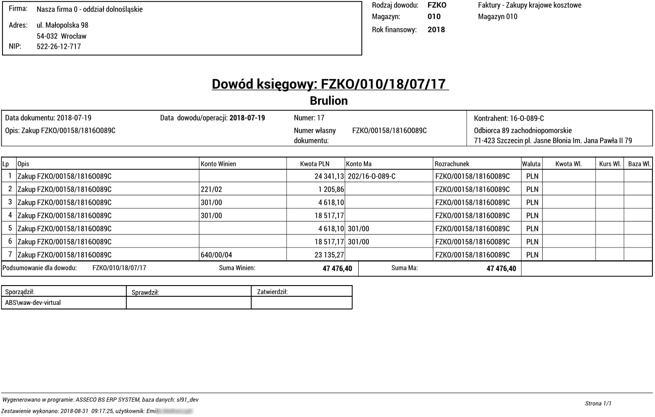 Rys. Przykładowy wydruk dowodu księgowego