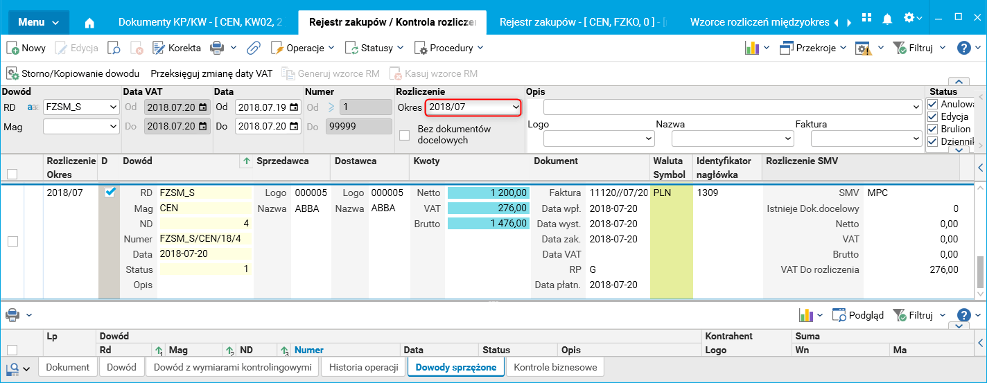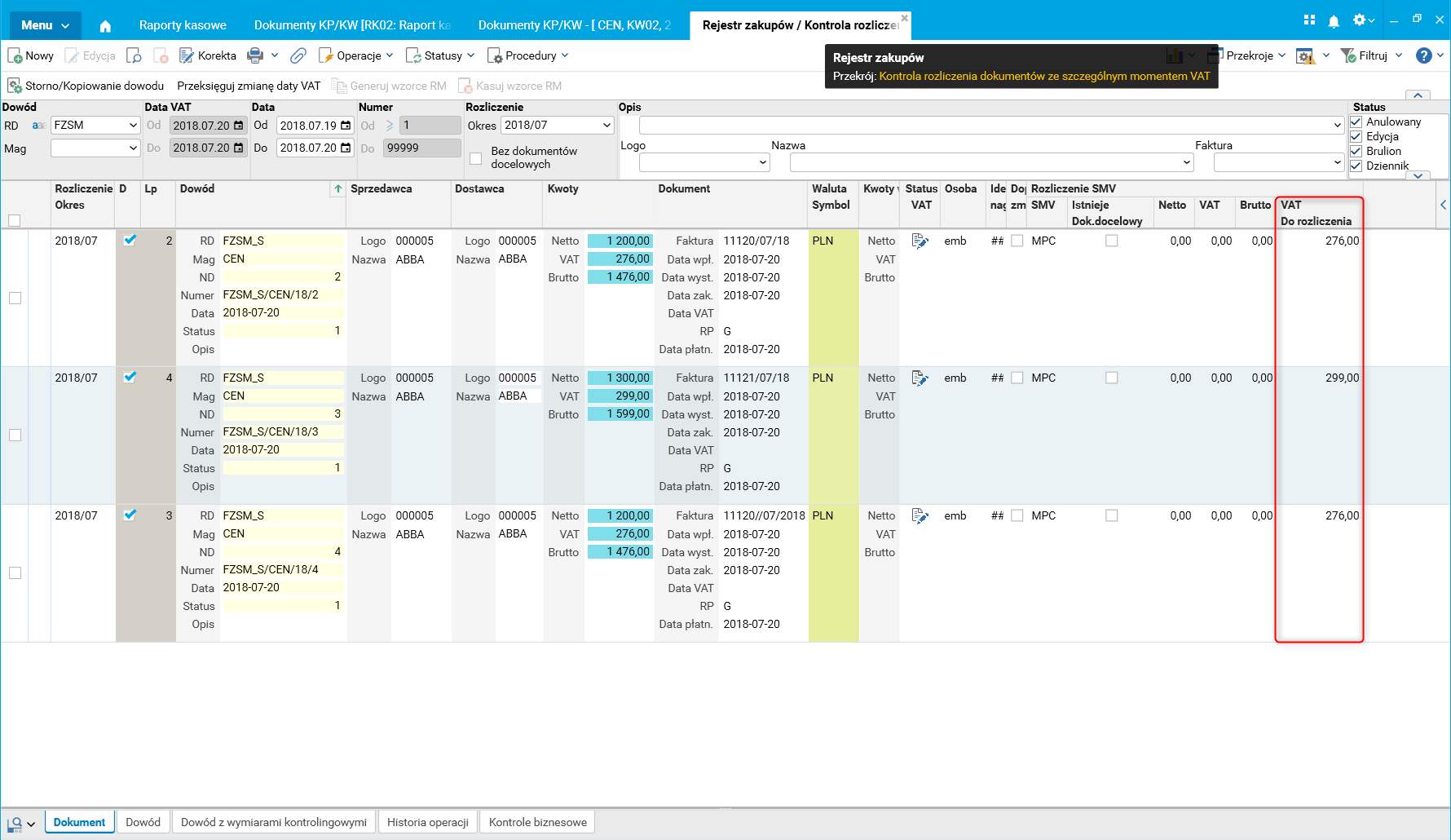 Rys. Przekrój Kontrola rozliczenia dokumentów ze szczególnym momentem VAT Rejestru zakupu