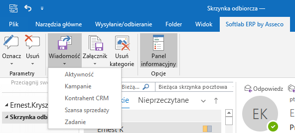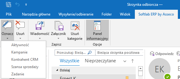 Rys. Przyciski funkcyjne na wstędze Softlab ERP by Asseco w programie MS Outlook