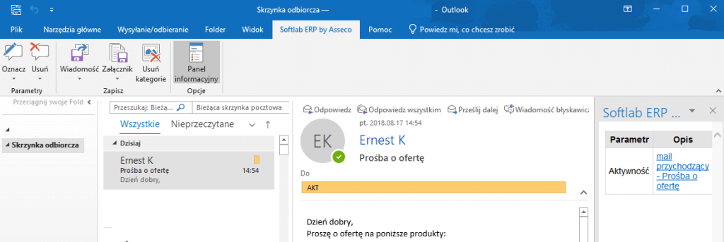 W programie MS Outlook wiadomość ta zostaje oznaczona dwiema kategoriami: jedna wskazuje obiekt, z którym została powiązana, a druga sygnalizuje załączenie wiadomości jako załącznik. Powiązanie widoczne jest w panelu informacyjnym.