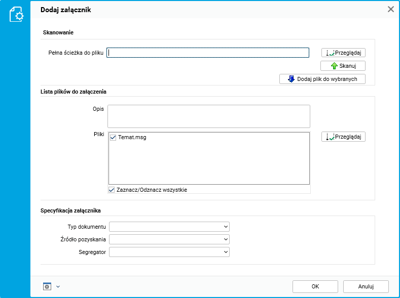 Rys. Formatka dodawania załącznika. W plikach do załączenia znajduje się wiadomość (Temat.msg)