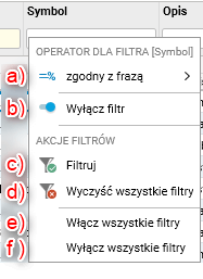 d. Wyczyść wszystkie filtry – Przywrócenie domyślnych ustawień filtra,