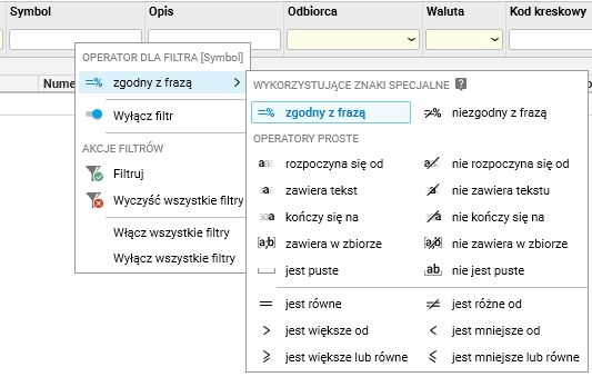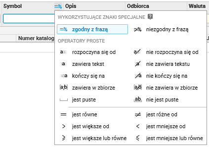 Rys. Lista operatorów wyświetlana po kliknięciu ikonki operatora na filtrze