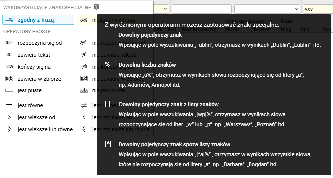 (nie) zawiera tekst (wyszukiwanie wg schematu: „%tekst%”)