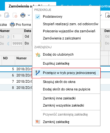 · Wybierając opcję Przełącz w tryb pracy jednoczesnej z menu podręcznego zakładki (pod prawym przyciskiem myszy),